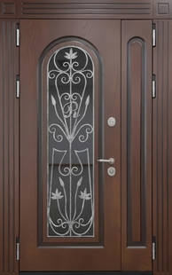 Полуторная стальная термодверь с большим стеклом, кованой решеткой и коричневыми плитами МДФ отличный выбор для тех, кто ищет практичное и красивое решение. МДФ-панели выполняются с точной фрезеровкой, подчёркивающей геометрию и стиль модели. Позволяют добиться гармонии с архитектурой. Отделка создаёт завершённый образ входной группы.