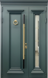 Полуторная входная термодверь с карнизом, металлобагетом, стеклом, длинной ручкой, кнокером и зеленым порошковым напылением отвечает актуальным стандартам качества и визуальной гармонии. Благодаря высокому качеству сборки дверь демонстрирует отличные эксплуатационные характеристики.